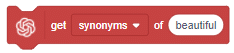 The block makes a request to ChatGPT to get the synonyms or antonyms of the text specified in it. The response of ChatGPT is then stored in PictoBlox and can be accessed using the get AI response block.