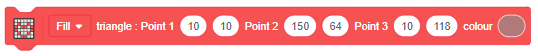 The block is used to draw an outline of the triangle or a filled triangle from three points on evive TFT display. It takes the color and the 3 points for the corner of the triangle to draws a triangle.