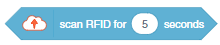 The block activates the RFID sensor to read any nearby RFID tags for the specified time. Once identified, the value of the reading is stored in the local system which can be used from the other blocks. The block also reports whether the operation is completed or not. If any RFID tag is scanned the block returns 1, else it returns 0.