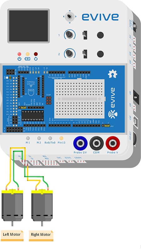- Now, fit the wheels into the protruding motor shafts.